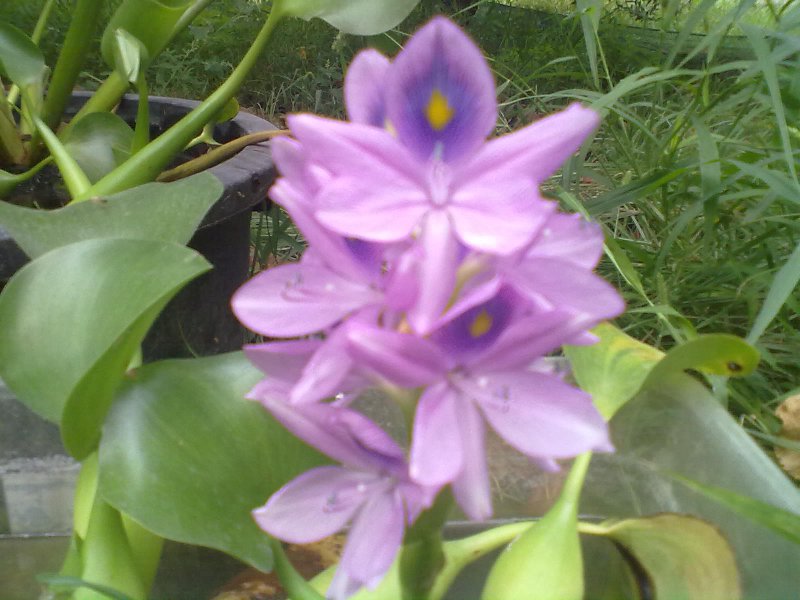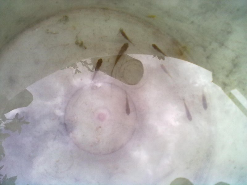 la vasca è circa 600 litri penso, i pesci non sono stati separati dagli avannotti per scelta di mantenere un tenore di vita simil-naturale,infatti su 1000 uova deposte la percentuale di mortalità è del 98%.nella vasca c'è anche un black bass di 10 cm.Gli avannotti si rifugiano nelle radici del giacinto che sono enormi.