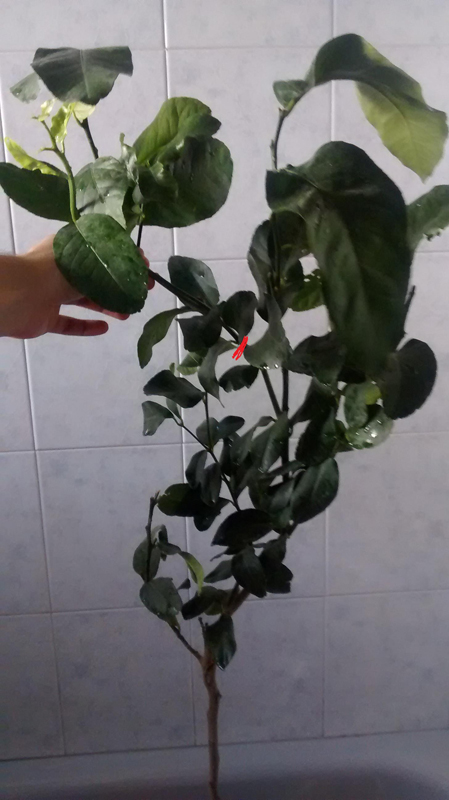 veniamo al limone. Ahime era poco ramificato, e ovviamente con mia somma sfortuna :evil: uno dei pochi rami, il piu bello, è spezzato. il punto di rottura è evidenziato in rosso nella foto...ora che faccio?? ovvio taglio e provo a fare una talea...ma della pianta che mi resta? ovvio l'avrei dovuta potare prima o poi per dare forma ma così tanto no...oracolo ho delle speranze?