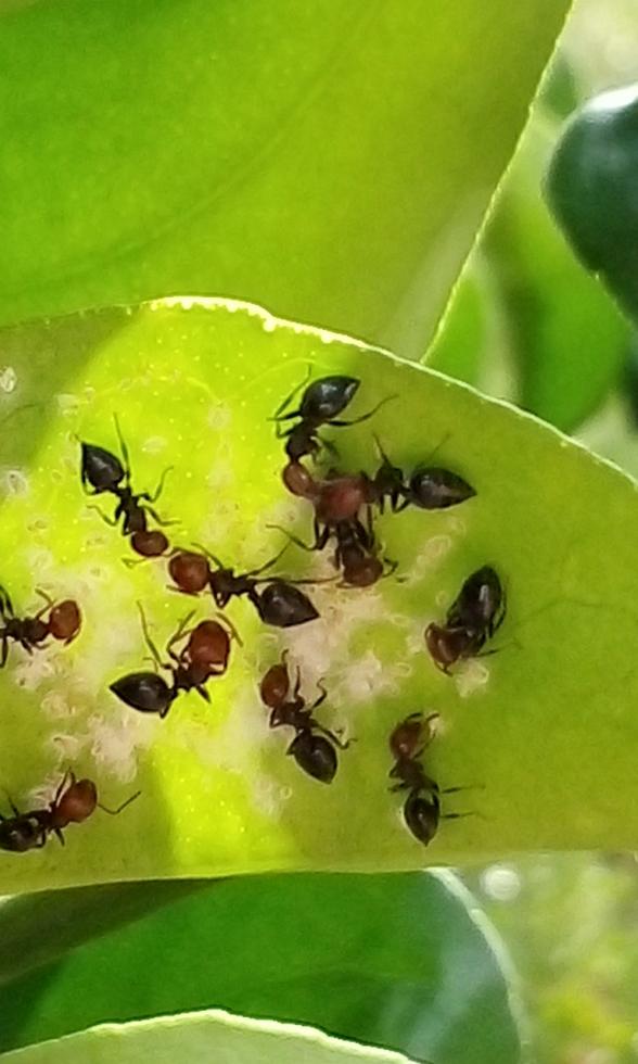 Le formiche non predano ma al contrario titillano gli afidi per sollecitarli e rilasciare goccioline di melata. Nello specifico non si tratta di afidi ma di aleurodide fioccoso. La seconda foto è relativa alla minatrice serpentina degli agrumi.