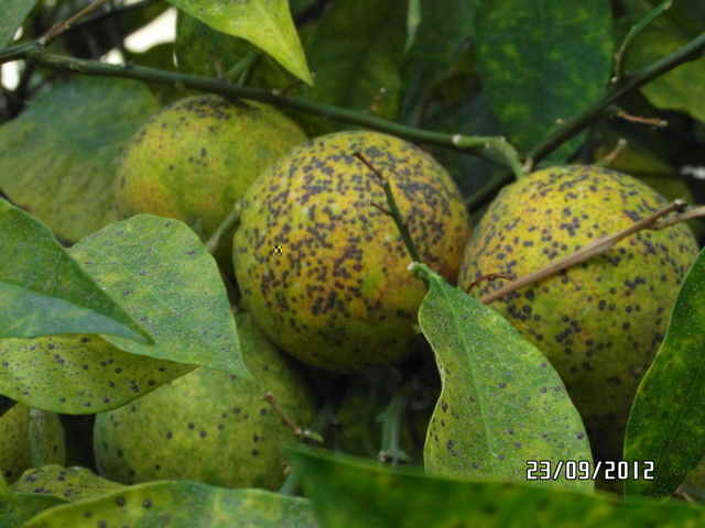 Tutti i frutti e le foglie si sono riempiti di puntini neri. Le foglie cadono copiosamente e i frutti si spaccano