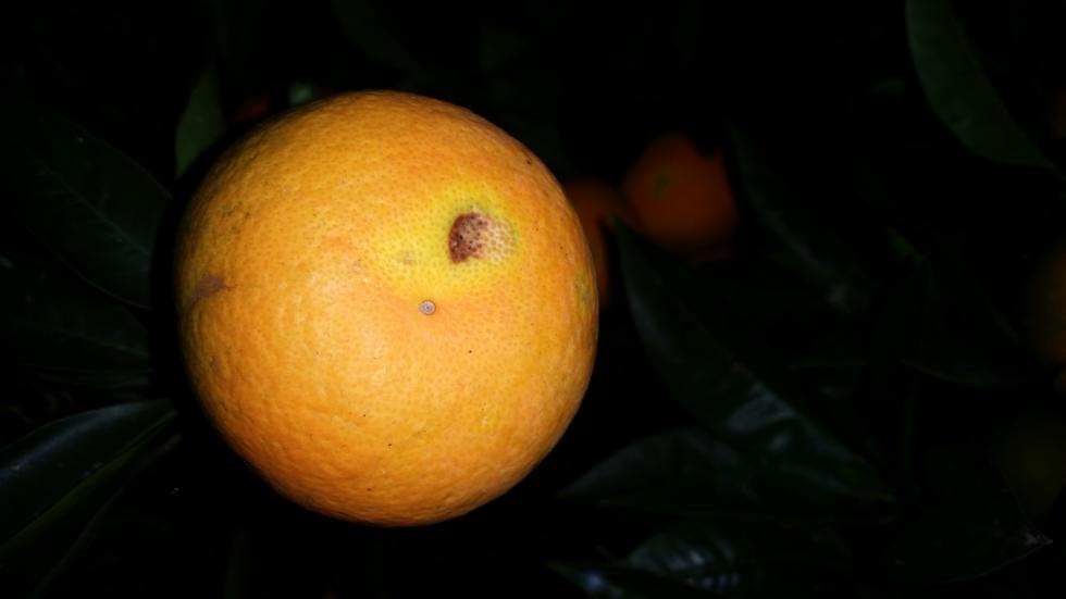 Se la buccia è rosicchiata possono essere lumachine, diversamente è una alterazione molto probabilmente abiotica, ad es. una oleocellosi. In pratica qualsiasi agente anche non parassitario (spesso il freddo) che provoca un punto di alterazione si ha fuoriuscita dalle ghiandole di olii essenziali che sono sufficientemente corrosivi da allargare la lesione con necrosi o suberificazioni.