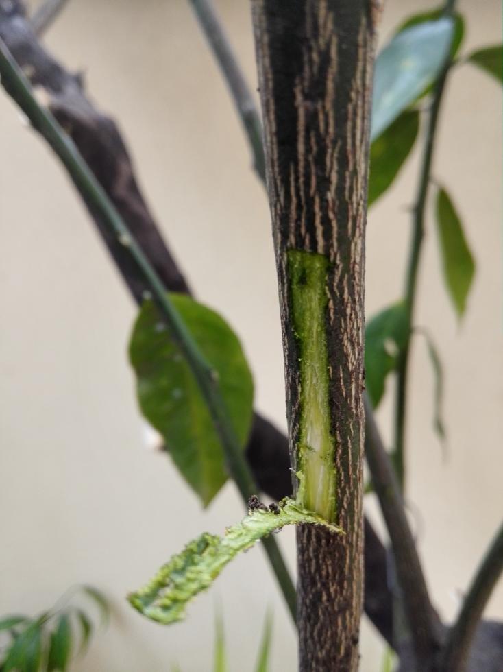 Grazie di cuore a tutti! Aggiungo un paio di immagini di scortecciamento dei rami recisi. Quello che resta un mistero, ormai, è solo l'infiorescenza fuori tempo... Mah! Chissà che è successo. In merito alle azioni contro i parassiti avrei qualche domanda. L'albero è molto alto, più di 7 metri, un mio intervento con la pompa a spalla non professionale darebbe gli esiti sperati? Sono molto spaventata dalla tossicità per gli uomini degli insetticidi chimici. Non è che per salvare la pianta mi avveleno io??? Inoltre, se avvio ora una disinfestazine, i frutti che matureranno potranno essere consumati? Per quanto riguarda la potatura, devo aspettare la primavera per fare una bella tagliata rinvigorente? E per una opportuna concimazione quando, come e con cosa devo procedere? In fine, questo sfoltimento importante del fogliame da cosa è dipeso? Le foglie che cadono non sono le più infestate. Sono ingiallite lungo il fusto e verso i margini e sono tutte senza picciolo, il quale cade in un secondo momento. Insomma, se stesse nella vostra aiula, passo dopo passo, cosa fareste? Grazie i finite. Luisa P.S. c'è un altro piccolo malato grave del quale vi chiederò più in là, mandandovi qualche foto. Non so nemmeno se si tratta di un arancio o di un limone, perché è nato spontaneamente e non ha mai dato frutti. Ma ne parleremo poi, ora c'è fin troppa carne a cuocere