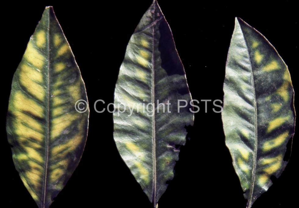 Carenza di magnesio su arancio dolce - Colorazione gialla da magnesio carenza su foglie mature di arancio dolce. Si noti la caratteristica colorazione verde più ampia verso la base del picciolo