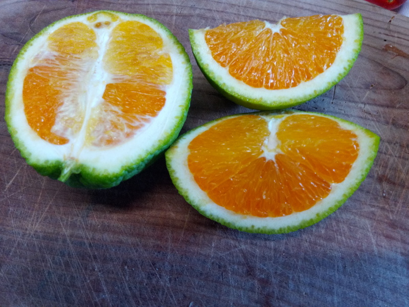 Ho tagliato quella della foto...succosa e poco aspra Ho un'altra varietà di arancio che produce frutti rotondi (a volte col fondo piatto e l'ombelico) con buccia sottile, quelli riescono a diventare arancio e sono buoni
