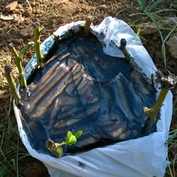 sacchetto di plastica e secchio che isolava di più..la pianta è stata irrigata 45 giorni dopo l'innesto.