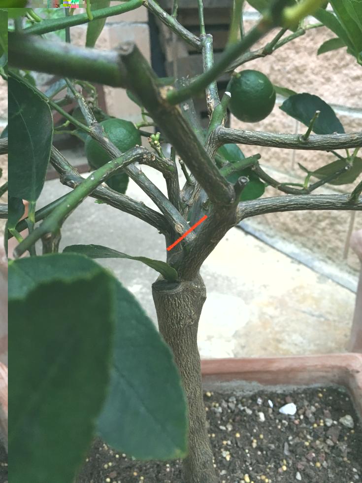 pianta questo vada tagliato. Anche perchè se le branche che ora si sfiorano si ingrandiscono poi si strozzeranno. Quindi, riassumendo.... che faccio? Taglio dove c'è la linea rossa? Se sì, si taglia tangenzialmente alla branca originale o lascio qualcosa del ramo che andrò a tagliare?. Ovviamente ci andrei a mettere del mastice addizionato a rame