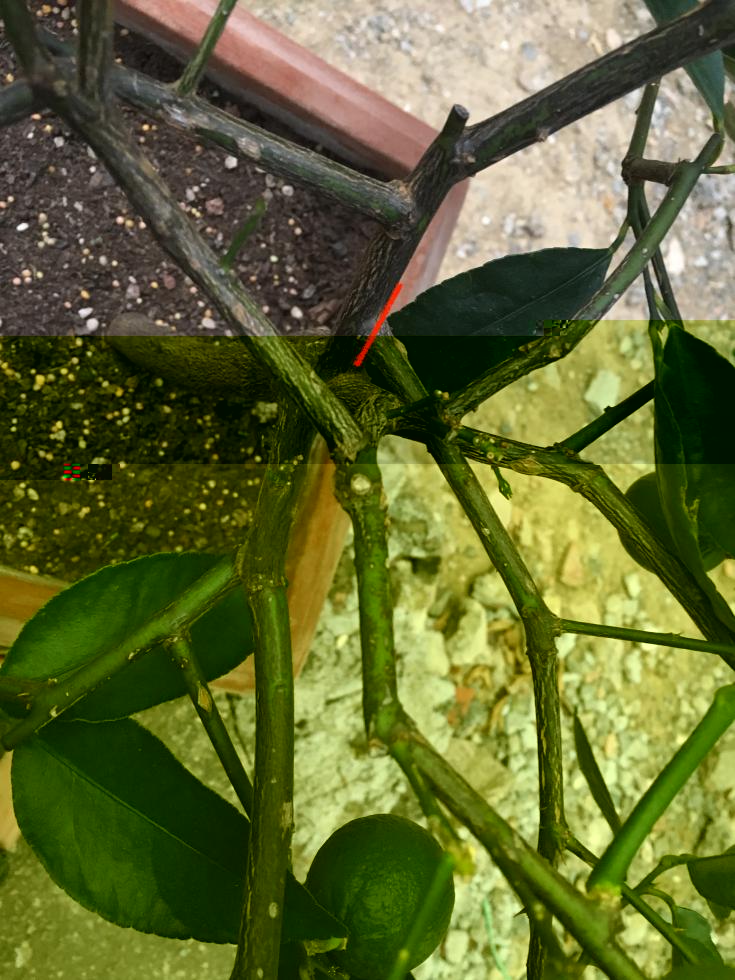 data da un ramo secondario che origina da un ramo primario che sta nella parte opposta. Praticamente questo ramo e rivolto verso l'interno della pianta, l'attraversa toccando altre branche principali e poi rispunta dalla parte opposta. Ora, su questo ramo c'è un frutto e aspetto che sia maturo. Ma credo che per la futura geometria della