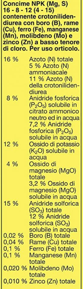 Ok! Il chelato che avevo è finito, frugando nel mobiletto ho trovato una bustina, però è aperta ed ha parecchi anni sicuramente... L’ho dimenticata, e quindi l’ho abbandonata a fare polvere non sapendo nemmeno di averla. Per caso perde efficienza, o scade in qualche maniera? Potrei usare questa, oppure mi conviene prendere un’altra bustina? Un’altra domanda, ora che ho già concimato, se voglio rinnovare il terreno mi tocca aspettare l’autunno giusto? La manciata di organico che dici tu, intendi stallatico, lupini, concimi fatti con scarti vegetali e animali, fondi di caffè... giusto? Per quanto riguarda il chelato ci sono delle percentuali da rispettare in termini di ferro? (Ti mando la foto della composizione del mio!) Mi hai detto che nel concime che ho messo c’è poco ferro, ma tutto sommato va bene come composizione? È di una marca abbastanza nota e pensavo di andare sul sicuro prendendolo, dura 3 mesi a lenta cessione.