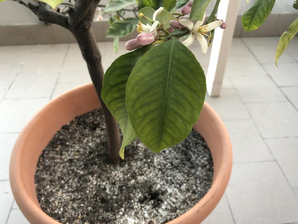 il ferro presente nel concime non è molto ed il limone ne consuma molto. anche il terriccio è un pò vecchiotto ,ogni anno andrebbe un pò rinnovato asportandone una parte e mettendone del fresco,oppure aggiungendo una manciata di organico in autunno può anche darsi che sia diventato alcalino ma io ho acqua più dura della tua ma non ho clorosi. dai il chelato di ferro rispettando la dose.
