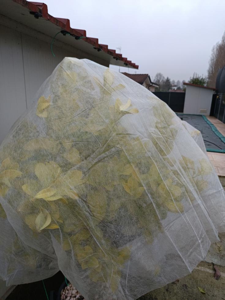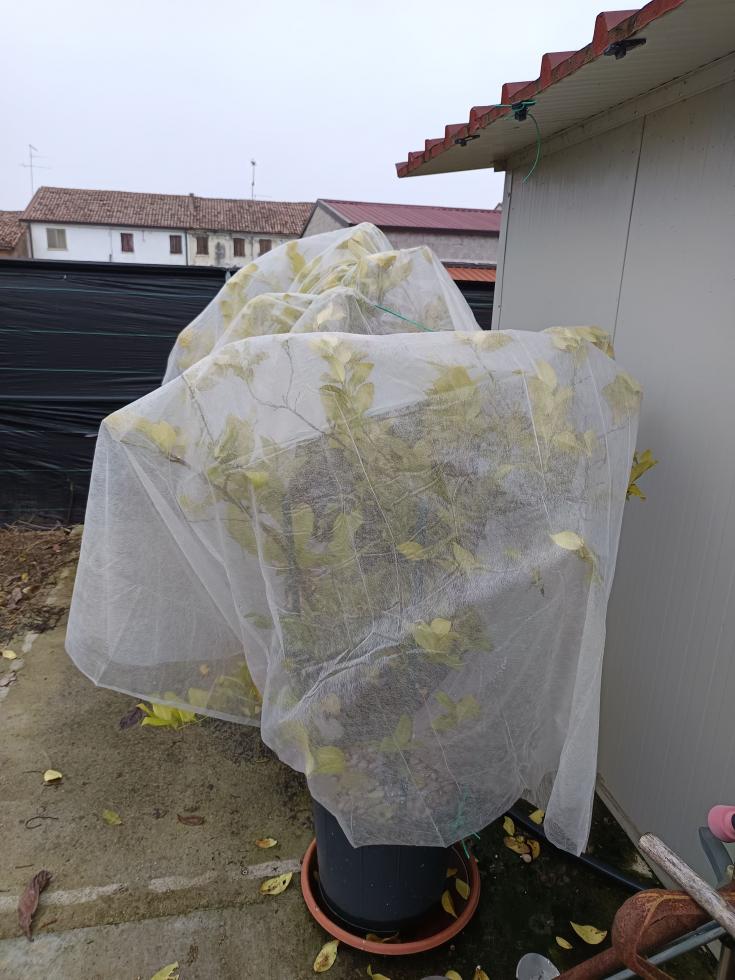 Togli il sottovaso che mi pare abbia acqua. Il telo sugli agrumi dovrebbe stare distaccato, metti 4 paletti nel bordo vaso e poi il TNT sopra