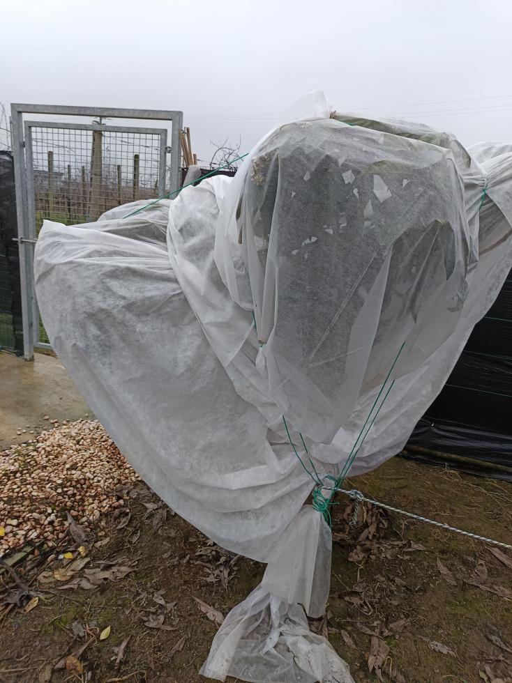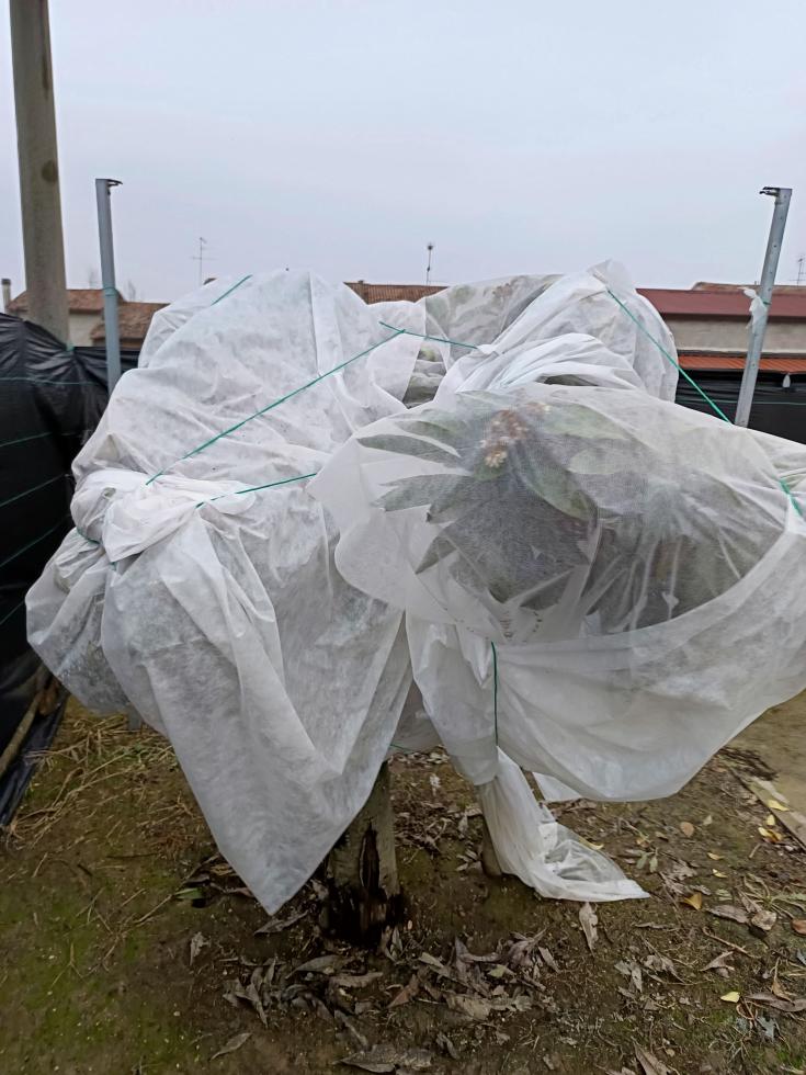 Fallo scendere fino a coprire anche il vaso ,passa un cordoncino attorno al vaso x tenerlo fermo. Che spessore ha il telo, se è leggero mettilo doppio. X le altre piante non ti so dire.