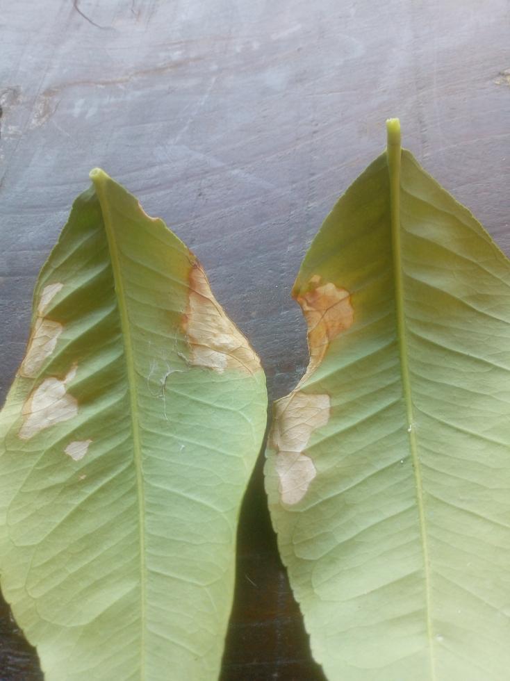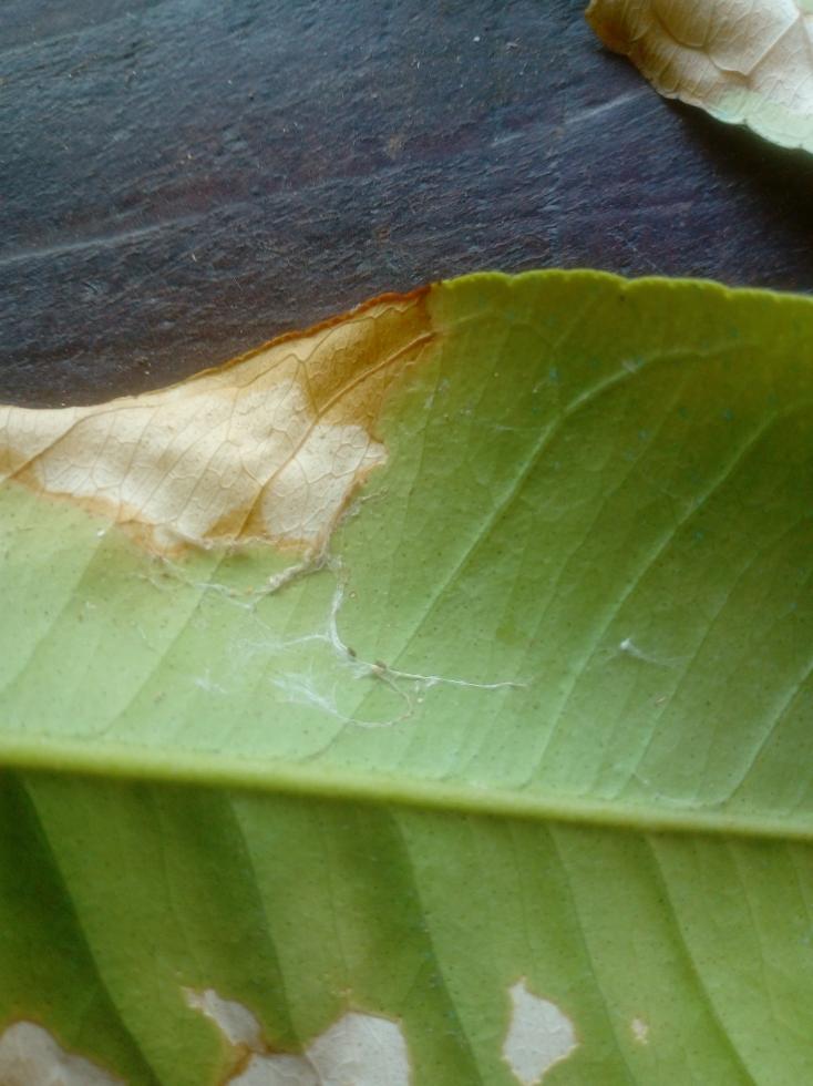 io non vedo niente a parte un filamento che pare sia una ragnatela. controlla se all'interno della foglia ci sia qualche larva ma ne dubito, di solito fanno una specie di bozzolo unendo anche 2 foglie vicine e dentro trovi la larva ma non mi pare. non è nemmeno serpentina,vedresti le gallerie e poi la foglia arrotolata al bordo da dove la larva esce sfarfallando.
