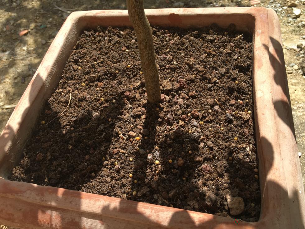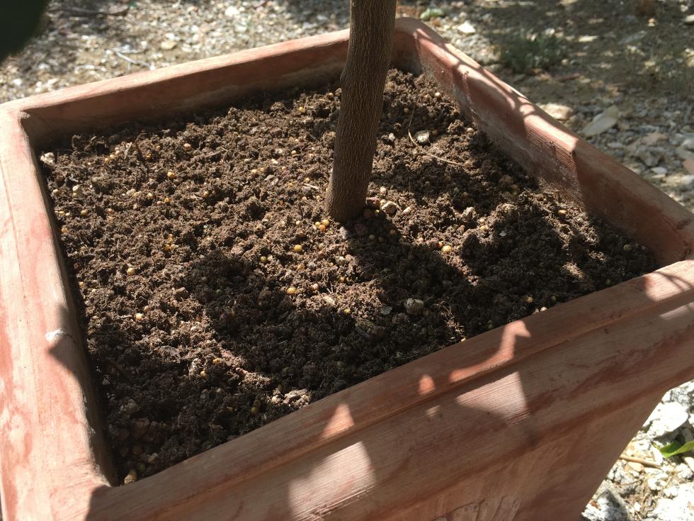L'olio bianco l'ho dato alle 7.30 di sera quando le piante erano già ombreggiate da un po'. In quei giorni aveva fatto delle belle piovute, tanto che la minima notturna era inotrno ai 15. Le annaffiature le faccio al bisogno. Adesso qui da me sono 43-45 gradi con un po' di venticello caldissimo. Il giorno dopo l'annaffiatura il terreno resto umido in profondità, ma dopo due giorni col dito trovo solo secco e quindi riannaffio. Cerco sempre di non far compattare troppo la terra, in modo che quando annaffio l'acqua non viaggia in superficie ma venga subito assorbita. Sto attento a non bagnare mai il colletto. Ti faccio vedere la terra. Ma può essere che gli agrumi non tollerano queste temperature?