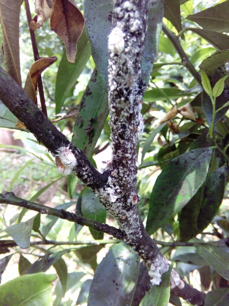 Ciao si tratta di cocciniglia a virgola, ma questo non influisce con il fatto che non fruttifica e nella crescita. Se le piante non crescono significa che non ricevono le giuste innaffiature e concimazioni.