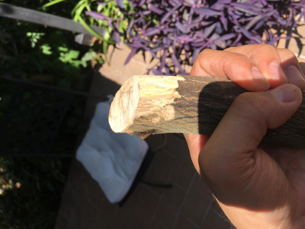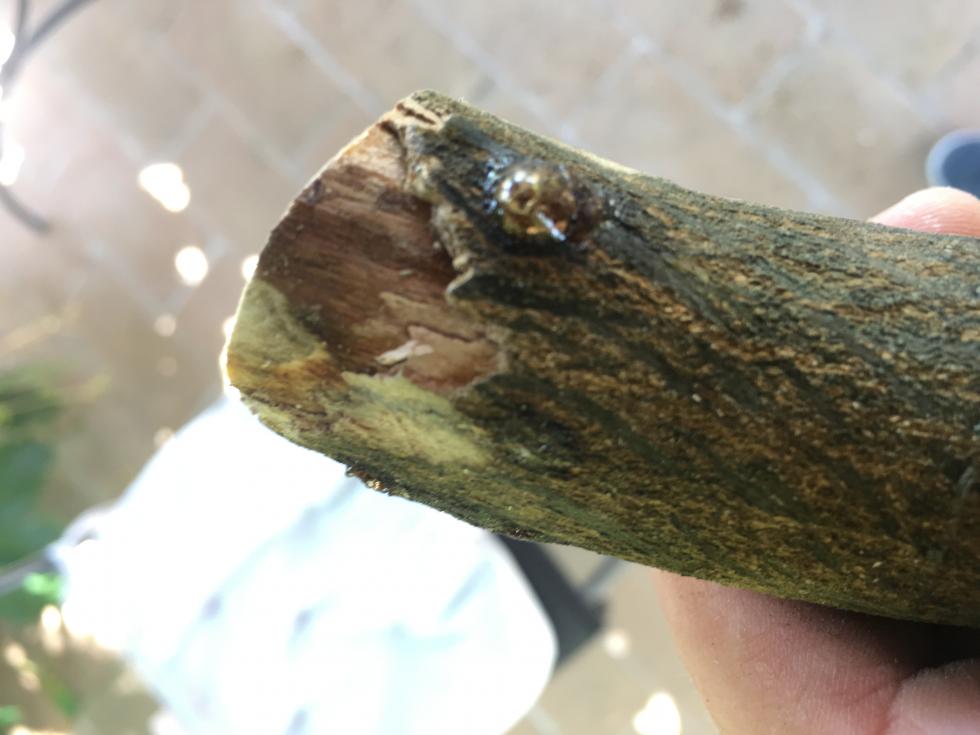 Ho proceduto a sterilizzare con fiamma una sega e ho fatto tagli successivi al ramo interessato. Tra un taglio e l'altro ripetevo la sterilizzazione della lama. Ho provato a togliere la corteccia dalle varie sezioni ma non è stato