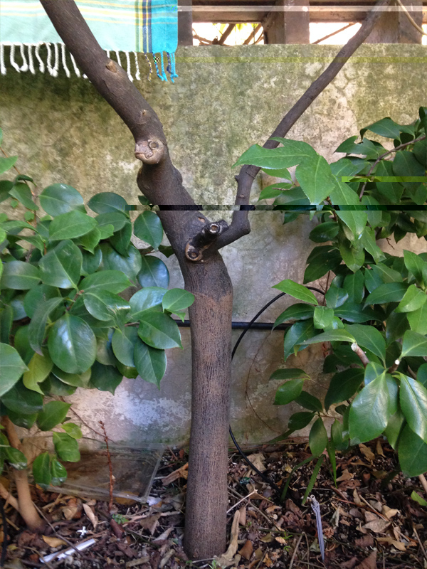 l'ipotesi 1 propongo di potare drasticamente la pianta sui due rami principali della branca sinistra, all'altezza del muro più o meno. Parallelamente potrei accorciare di un paio di nodi i rami restanti.