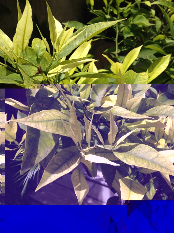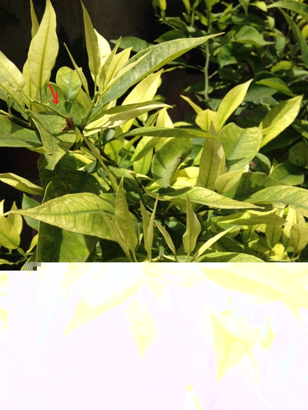 Cause possibili:- Il problema principale, credo, è la chioma del nocciolo, che mantiene completamente in ombra l'arancio e che andrà sicuramente potata drasticamente in autunno.