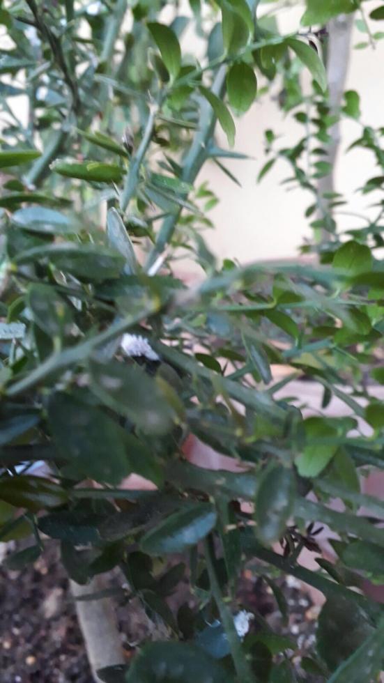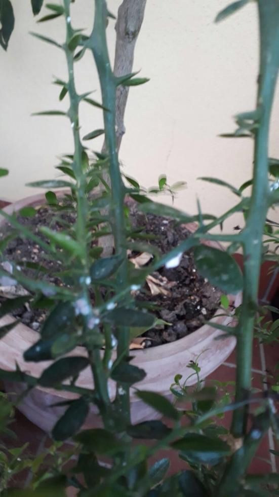 Ieri il mio amico mi manda queste tre foto con blasfeme richieste di aiuto. E' il suo finger lime. Ora.... credo sia abbastanza scontato che si tratti di cocciniglia (bianca o cotonosa che sia). Le mando perchè in rete non ho mai trovato foto di un finger lime infestato da cocciniglia.