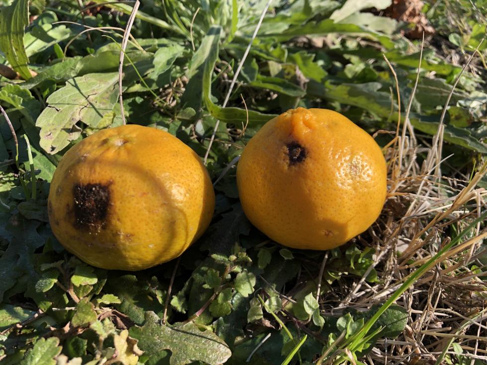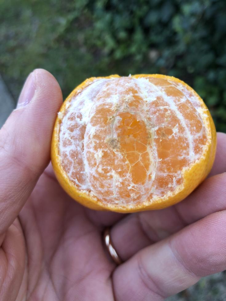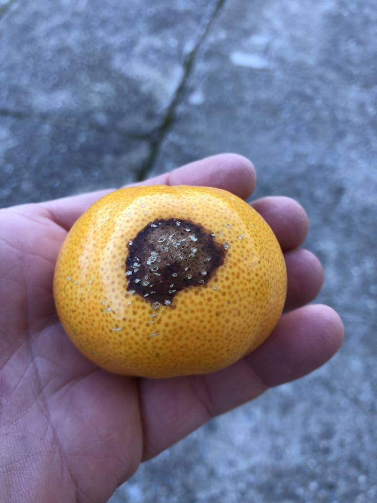 Scrivo per avere una vostra opinione circa un fenomeno di cascola dei frutti di un mandarino tardivo marzaiolo. Mi trovo in zona collinare 530m slm in provincia di Cosenza. I frutti hanno iniziato a cadere da dicembre, in maniera costante. Come da foto allegate, si forma una macchia marrone sulla buccia, che sembra una puntura di insetto, e dopo qualche giorno il frutto cade. Il frutto sotto la macchia è integro. Il sapore del frutti caduto non è cattivo, sembra solo un frutto leggermente vecchio e non fresco appena raccolto.
