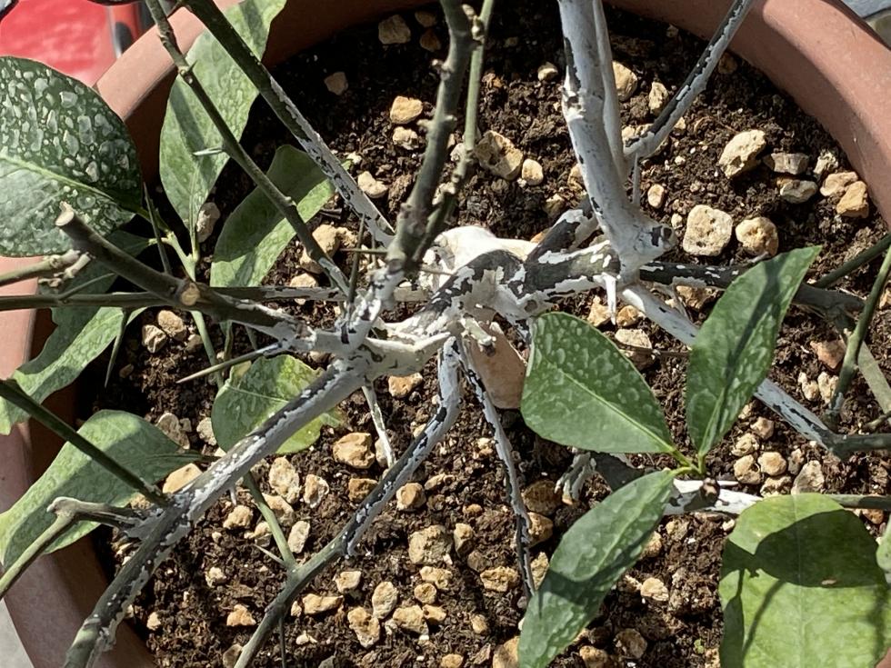 le foglie sono sole sporche se le lavi viene via ma secondo che trattamento. hai fatto per funzionare deve rimanere sporco. i rami secchi si vedono che le tocchi con unghia se non è verde è secco e quindi devi tagliare. grazie
