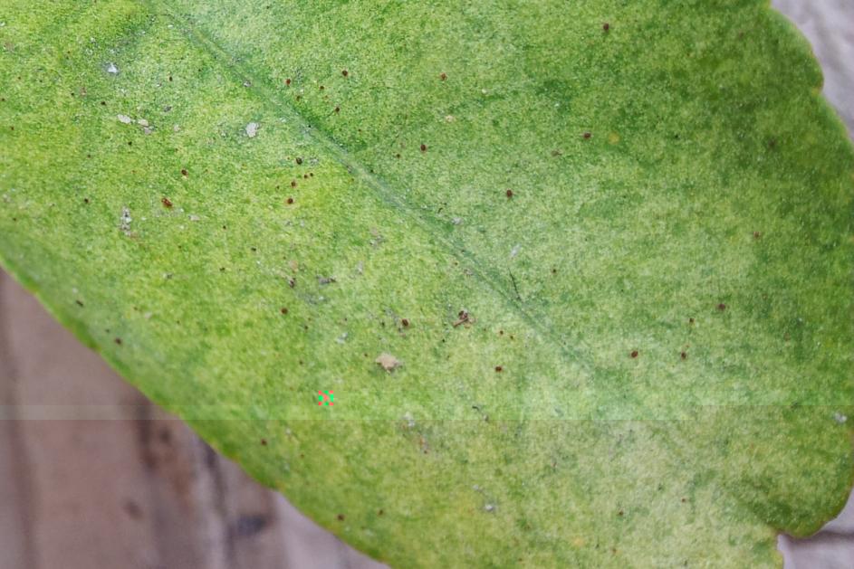 Circa la presenza di r.rosso (su agrumi ci può andare sia quello specifico che è di color rosso vivace sia quello comune in grado di tessere leggere tele - in una foto c'è qualcosa di sospetto ma potrebbe essere semplicemente tela di un ragno - che è di colore variabile dal giallastro-verdolino al rosso) come ti è stato raccomandato devi osservare con una lente un certo numero di foglie a campione (vd. foto: quello presumibilmente degli agrumi e quello comune)