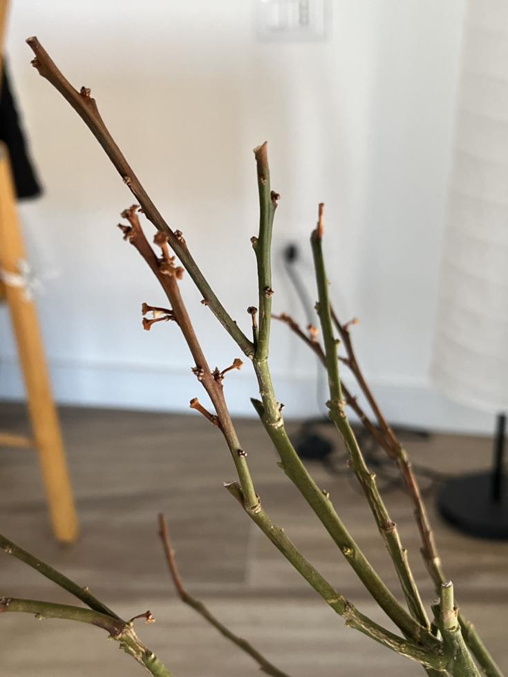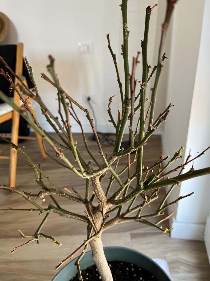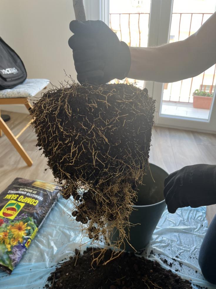 La pianta adesso ha perso tutte le foglie ed ho cominciato a vedere i rametti alle estremità cominciare a diventare sempre più color marrone chiaro. Ho deciso di dare una controllata alle radici per paura di aver soffocato la pianta con una innaffiatura di troppo.