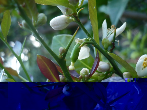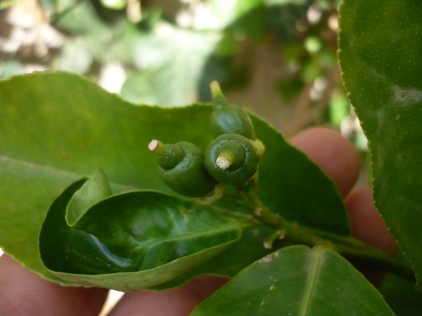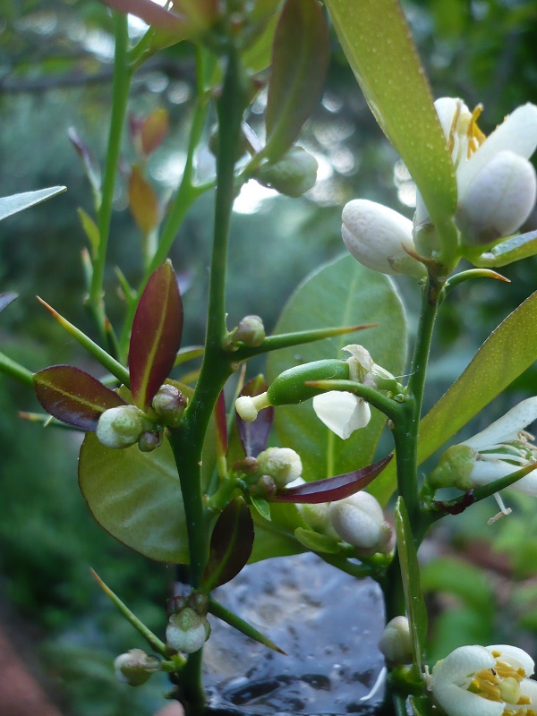 il finger lime innestato, ha messo qualche piccolo frutto ho notato che il finger lime messo in pieno sole con temperature elevate mette vegetazione in continuazione, se messo all'ombra si ferma
