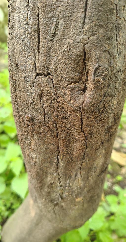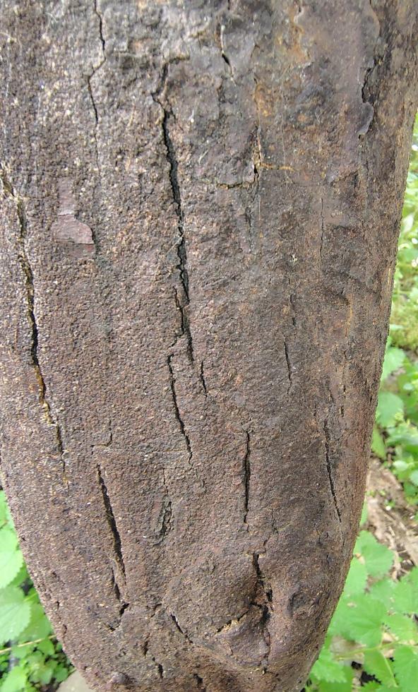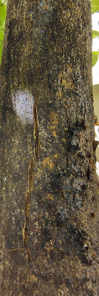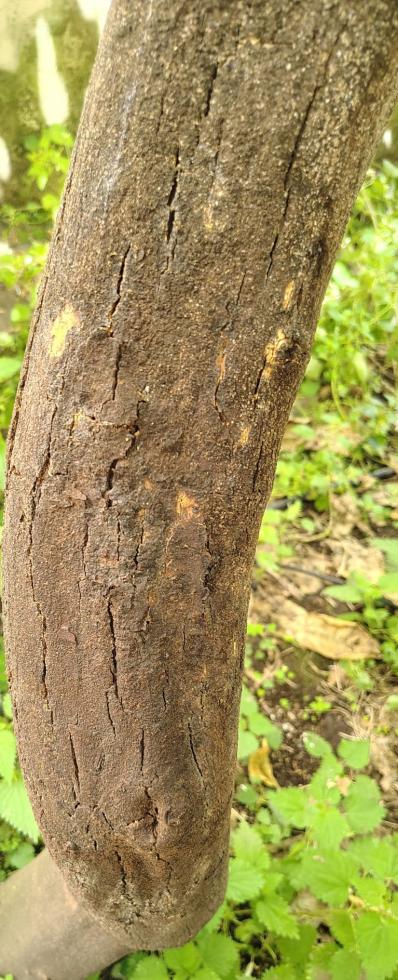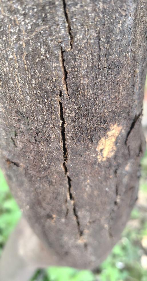 Il tronco mostra varie spaccature, sia vicino al portainnesto, sia più in alto su una delle branche principali e su un ramo ormai non collegano a nessun ramo "vivo".