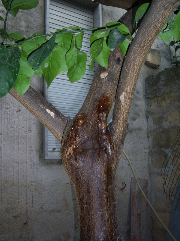 dovresti levare dove la corteggia è danneggiata e dinsifettare il tutto con un prodotto rameico poco diliuto con il pennello (userei un prodotto rameico) tipo pasta afferro, cupravit ecc..