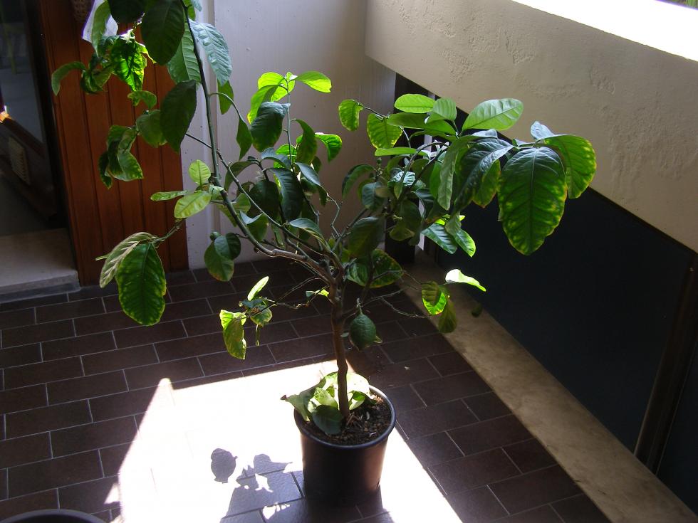Limone in vaso con foglie con macchie e che cadono