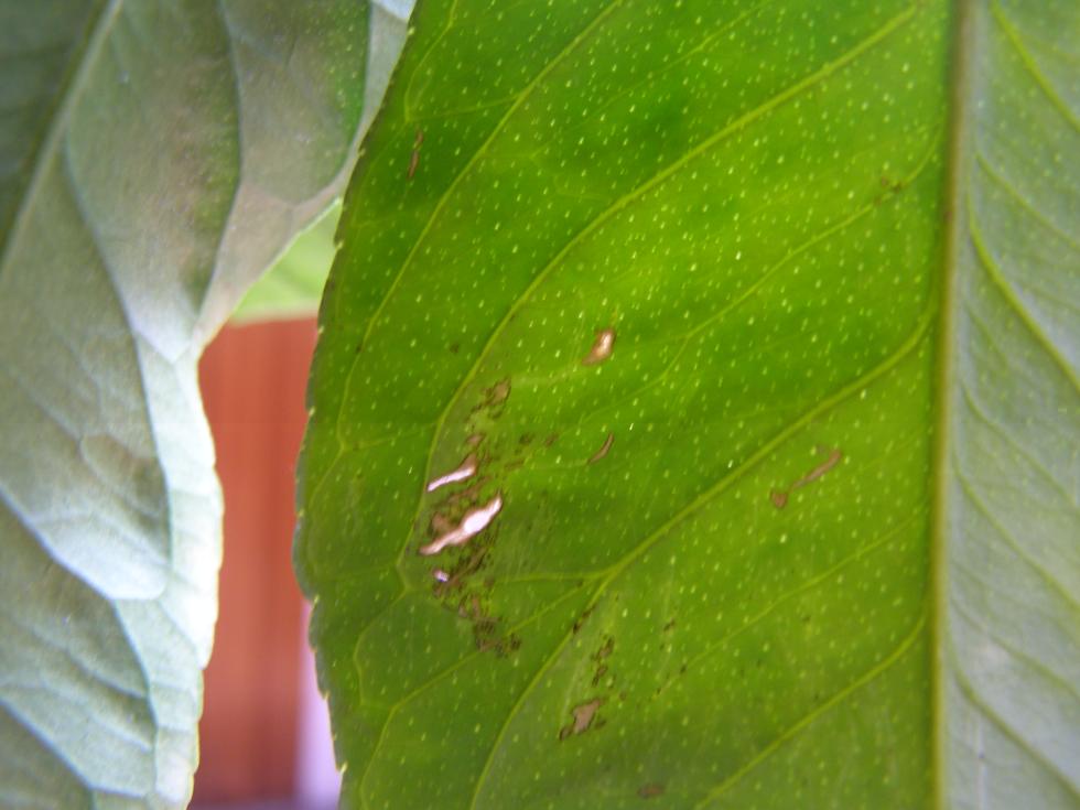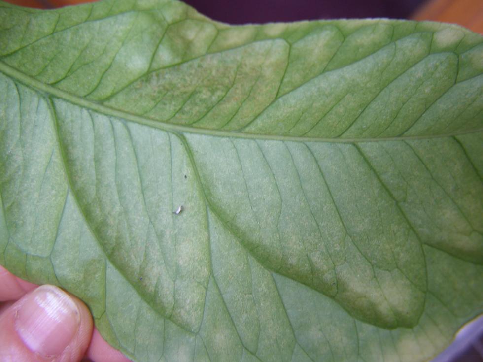 Sicuramente c'è qualche acaro, nella prima foglia si intravedono delle piccolissime ragnatele bianche se quarti attentamente le altre foglie magari li vedrai meglio.