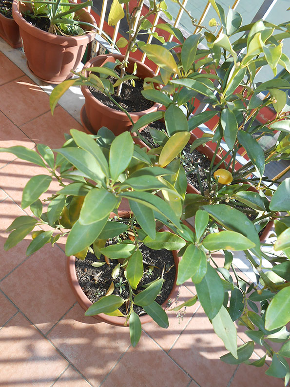 Ecco altre tre foto comprendenti anche il mio kumquat, anch'esso preda dello stesso problema (forse ancora più accentuatamente). Dai vostri commenti restringerei i sospetti a clorosi oppure squilibrio nutrizionale; l'ingiallimento parte dalla nervatura centrale e la foglia si indebolisce e cade ancor prima che si ingiallisca il resto. In quest'ultimo caso con che cadenza potrei concimare dato che siamo alle porte dell'inverno? Posseggo granulare, sangue di bue e specifico per agrumi.