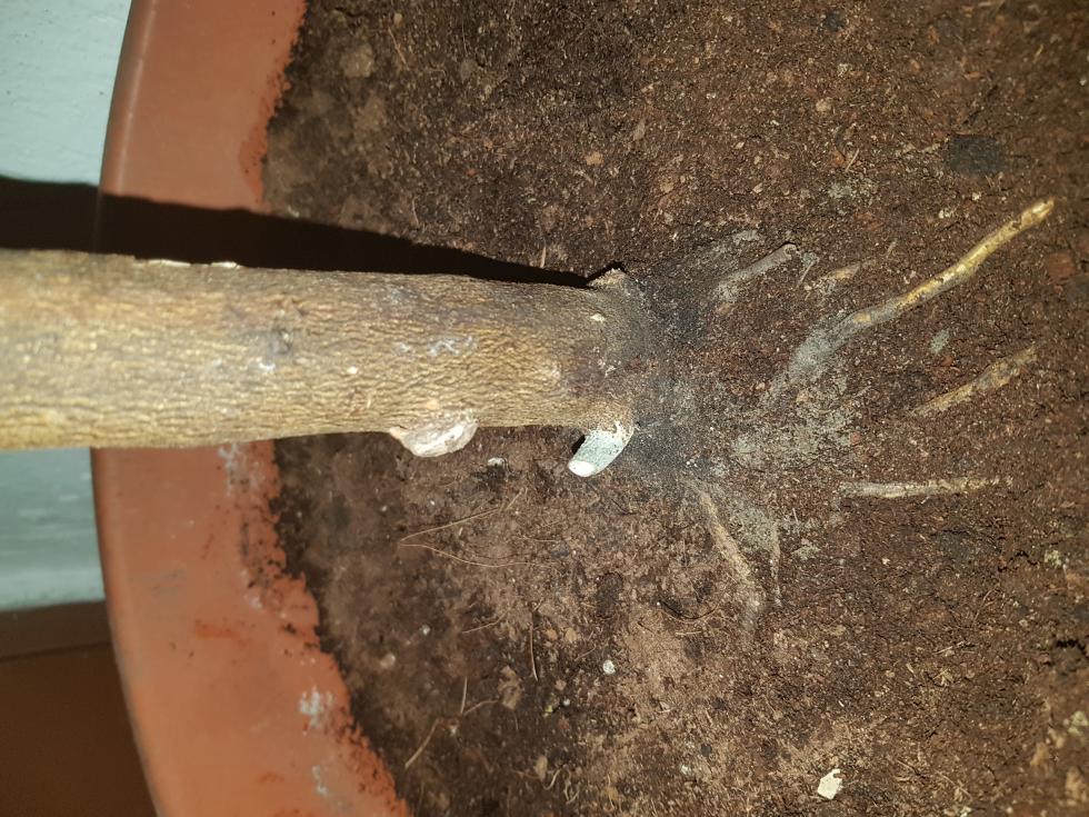 Ho chiesto consiglio presso un vivaio e mi è stato consigliato di tagliare il suddetto fusto e tagliare le parti secche, accorciare le radici e infine rinvasarlo, sul fondo ho messo uno strato roccioso e per il resto è unicamente terriccio.