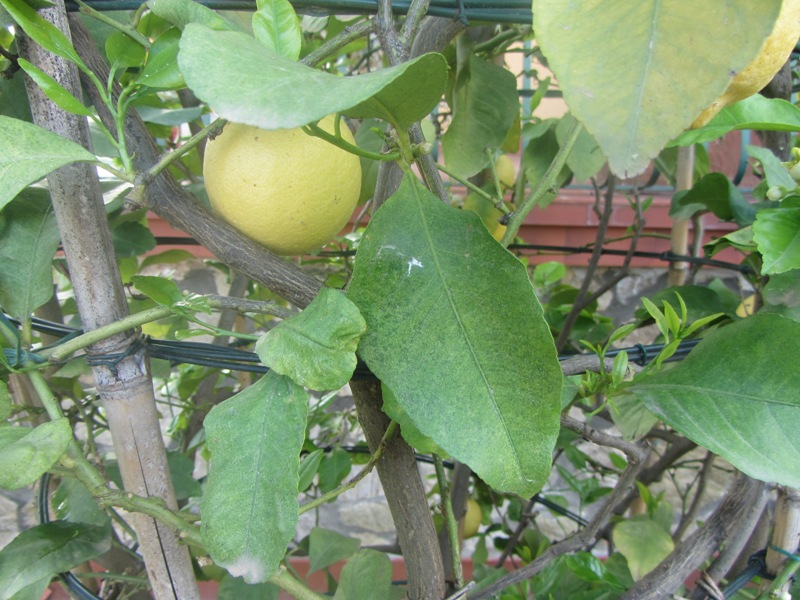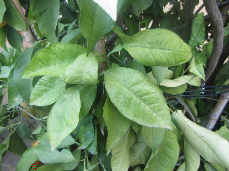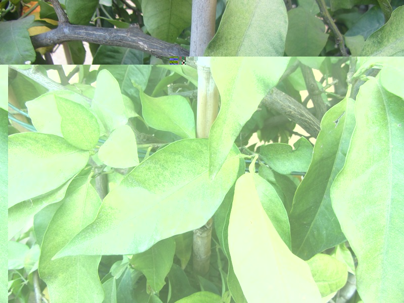 avrei ora bisogno di sottoporti un altro quesito. ho una pianta con frutti arancio e con limoni...i similaranci sono aspri ma non quanto i limoni. è una pianta molto fogliosa, simile agli aranci che ho, rispetto ai limoni che sono più sguarniti. ho trovato rare cocciniglie bianche anche su questa ma quello che mi ha colpito è il colore delle foglie come puoi vedere in foto. lo stesso "schiarimento" l'ho trovato anche su altre 3 piante più o meno giovani. mancanza di ferro o che altro?