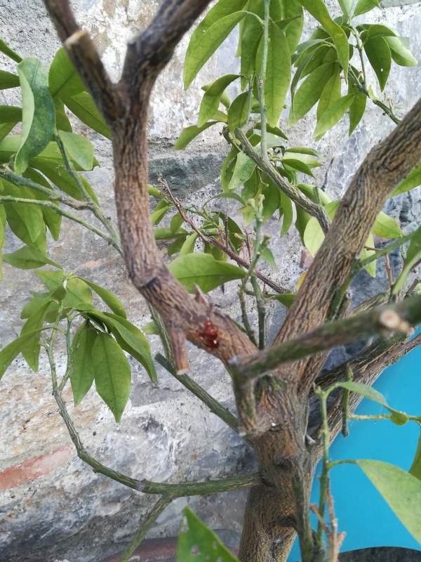 Mezza pianta è completamente secca. L'altra metà sembra stare benino... Su due rami si nota un versamento resinoso..