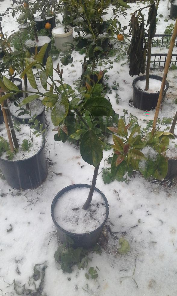 l'arancio sotto un portico riparato con 3 strati di TNT da 30 g (90 g complessivi), mentre il kumquat addossato ad un muro rivolto a sud anch'esso coperto da 3 strati di TNT..entrambi i vasi avvolti con pluriball.