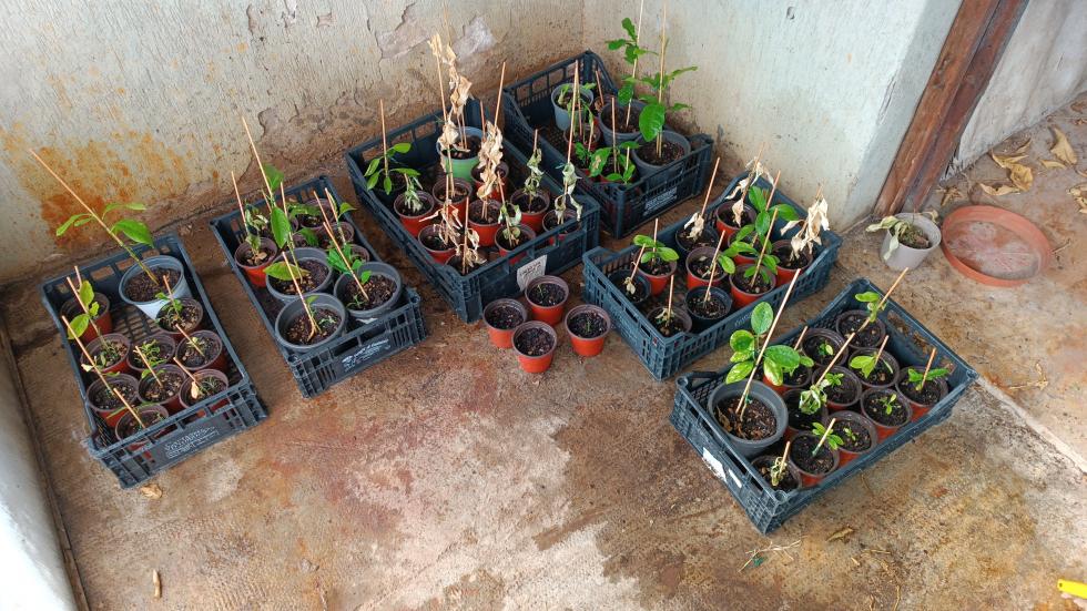 Piano piano ho visto che una dopo l'altra hanno iniziato a dare segni di sofferenza, prima abbassando le foglie e accartocciandole e poi seccandosi. Mi aspettavo che non tutte le piantine, visto il numero abbondante, riuscissero a sopravvivere all' inverno. Ho cercato di mantenere sempre controllata l' irrigazione, dando acqua quando vedevo il terriccio asciutto. Ora che la bella stagione è tornata, mentre le grandi sono state portate fiori in pieno sole, le piccoline dei semi le ho tenute sulla porta del portico, che resta sempre aperta adesso, per dare loro più luce e aria pur mantenendole protette (la temperatura all'interno è di un paio di gradi in più rispetto a fuori tenendo la porta costantemente aperta).