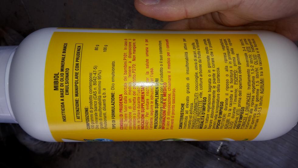 Cia a tutti. Ho comprato l'olio bianco per eliminare la cocciniglia. Dovrei trattare sia aranci si mandarini sia limone. Attualmente gli aranci sono in fioritura i mandarini no. I limone presenta solo foglie nuove dopo la potatura. Posso trattarli tutti o solo il limone e mandarino? Che quantità di olio per 10 litri d'acqua? Sulla confezione non c'è la specifica di quantità per gli agrumi. Allego foto della bottiglia