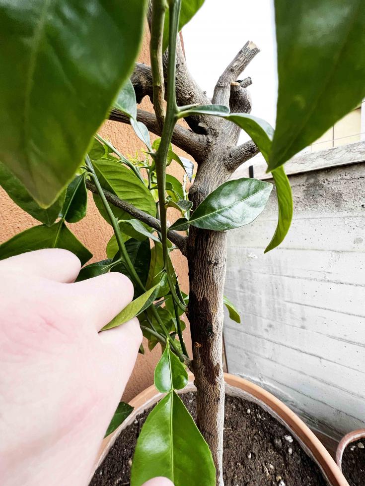 tutti i rami che hanno foglie con l'aletta grande sono del portainnesto,togli i rami tutto quello che sta sotto l'innesto va levato. il portainnesto è un arancio amaro.