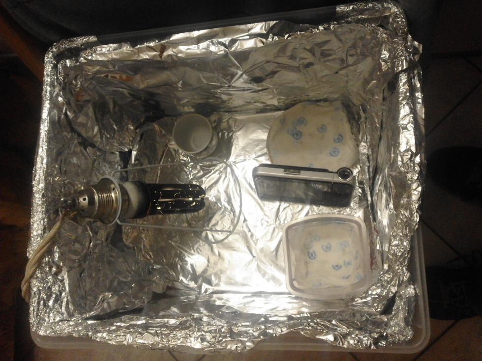 Ciao.mi sono organizzato meglio,(almeno per quanto riguarda la temperatura e lo spazio).Ho una lampada a basso consumo 20 watt e una di scorta a led a 12 watt:le ho verniciate con la vernice spray ad alta temperatura per marmitte do scooter, in maniera che sia presente la temperatura ma non la luce (anche se qualche fotone fugge via) e ho rivestito con polistirolo e carta stagnola il contenitore piu grande .Vi ho messo i semi avvolti nella carta assorbente e umidificati .Con un igrometro e termometro visualizzo con la lampada (accesa  ) circa 22 gradi e una umidita' del 68 per cento.Lascio un po' socchiuso il tappo del contenitore per il passaggio di aria.Ogni sera devo reidratare i fogli con i semi perche' il calore asciuga un po' la carta assorbente. Che dite funzionera'??