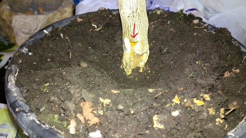 stana questa cicatrice! soprattutto la parte che ho segnato, sembra come quando si innesta a scudetto, ma manca la parte che si innesta cioè la gemma. come se qualcuno abbia provato a innestare a gemma. puo essere pure che si sia scortica con un colpetto di zappetta, ma che senso ha zappettare in un vaso. cmq togli un po di terra dal fusto fai anche una foto di tutta la pianta.