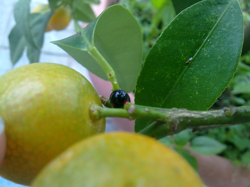 Inoltre ho trovato questa coccinella (tutta nera con 2 punti rossi) ferma nello stesso punto per tre giorni: che si stesse nutrendo di qualche parassita?