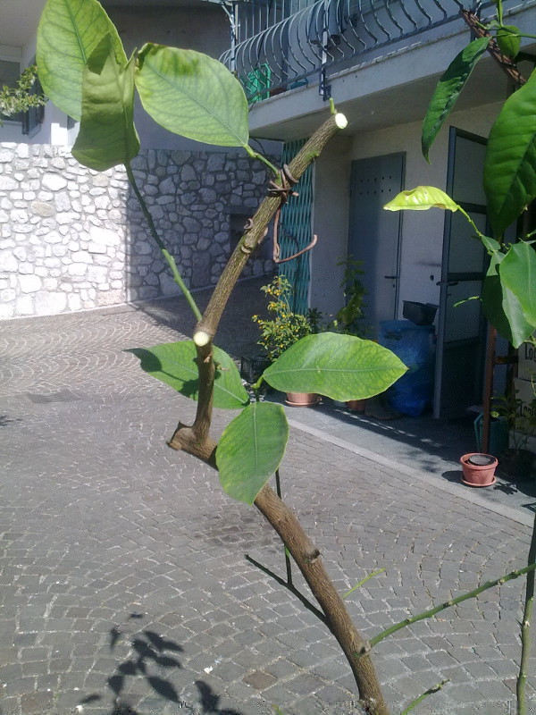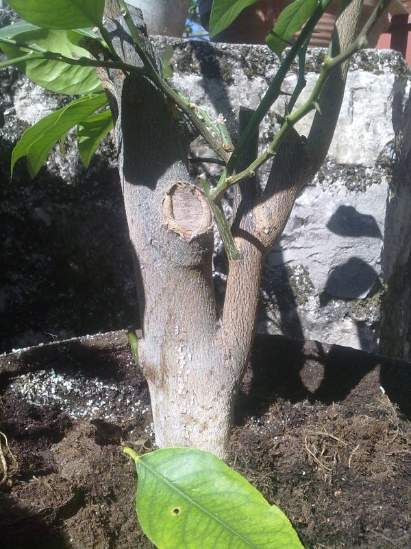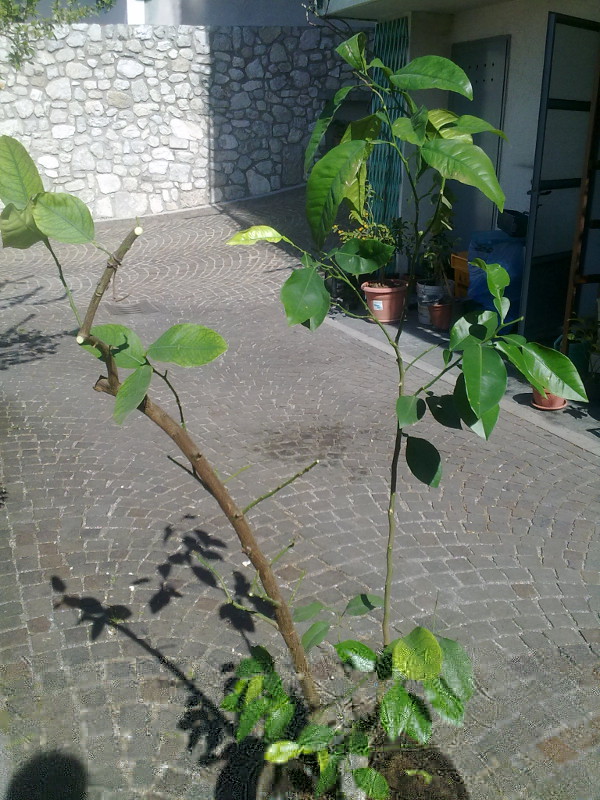 E' un limone ma non so la varietà e deve avere una 30ina d' anni. Era messo malissimo e l' ho gia potato ma non so se basta. Praticamente il limone è ridotto in un bastone grosso ed alto più di un metro con giusto alcune foglie incima, mentre da sotto l'innesto parte un succhione di arancio amaro di 1,5 cm ed altrettanto alto- Tutto è visibile dalle foto. Domanda: il limone lo risco a salvare? Devo tagliare ancora? o è meglio ripartire da capo ed innestare il succhione?