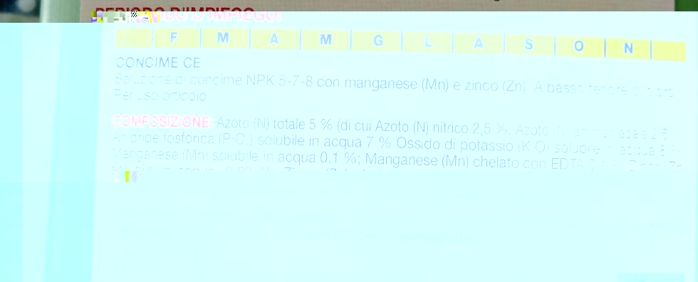 Ti allego le etichette dei due prodotti che uso ovviamente non faccio vedere le marche siccome tutti sto concimi liquidi li vedo un po' bassi quest'anno li ho usati in dose doppia la pianta sta veramente bene rispetto all'anno precedente ma queste foglie non mi piacciono ne tantomeno il fatto che non mantiene i frutti..per il ferro uso un prodotto a parte.
