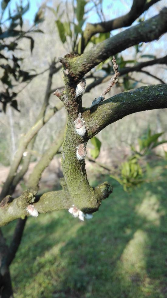 Se si preferisce l'olio bianco (si trova nei consorzi e nei garden center e negozi similari) è bene chiedere un olio di tipo estivo di buona qualità (in etichetta deve riportare U.R. 95% circa). Tieni ben presente che il successo dipende molto dal timing: da solo infatti a fatica riesce a uccidere gli adulti che sono ben protetti dallo strato ceroso che li difende, mentre sono molto sensibili le forme giovanili che nascono dalle uova (si susseguono 3 generazioni: primavera, inizio e fine estate) e migrano alla ricerca di nuovi siti su cui fissarsi (basta seguire giorno per giorno confrontando con in immagini es.