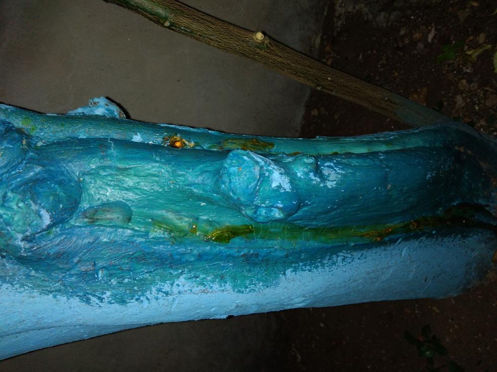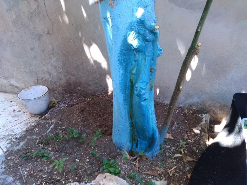 La poltiglia bordolese è stata applicata da circa un mese, con il tronco che presentava delle crepature nella corteccia ma senza rilascio di resina. Rimossi anche alcuni succhioni.