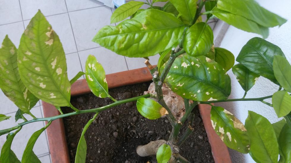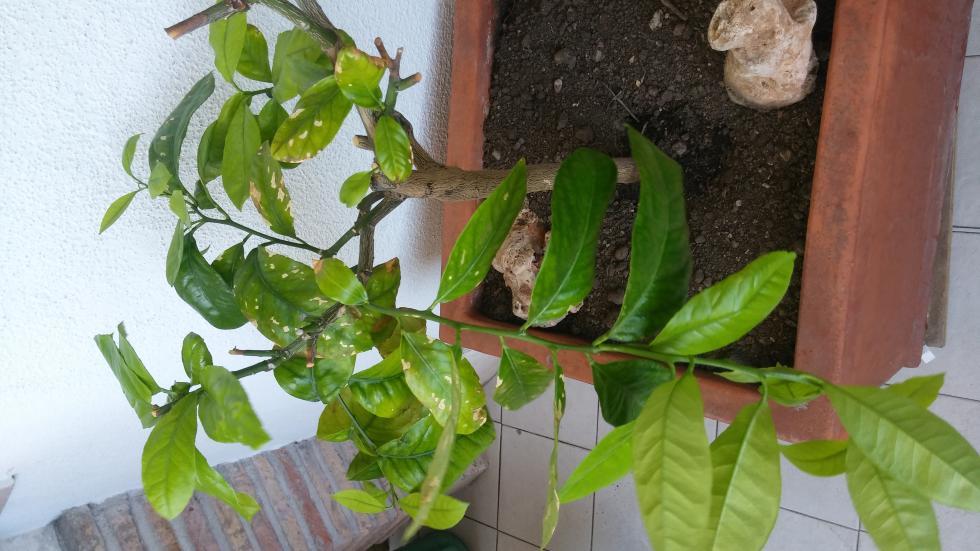 Ahimè rinfresco il caso con nuovi sviluppi negativi e a cui non so dare motivo non ho concimato ne dato alcunche' al limone tranne innaffiato a terreno ben asciutto per almeno 5 o 7 cm sotto la super vice dello stesso ma ad oggi stanno comparendo queste macchie sulle foglie come consigliato la pianta semiombreggiata in buona parte del giorno sopratutto al mattino ho come l' impressione che la cosa si sia valorizzata con l' innaffiatura boh!