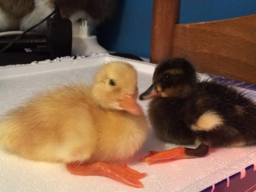 Oggi sono nati 3 anatroccoli, l'ultimo é ancora nell'incubatrice ad asciugarsi. Quello scuro potrebbe essere un ibrido, il giallo cosa potrebbe essere? Alla fine sono riuscito a trovare, in un molino, un mix per pulcini ma senza coccidiostatico,