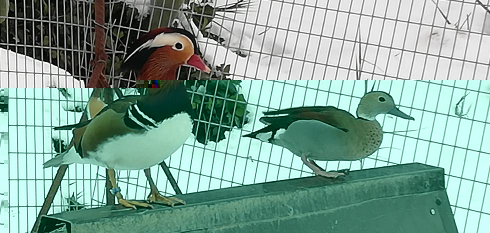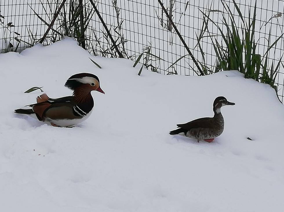 In questi giorni è caduta molta neve e il laghetto si era quasi completamente ghiacciato, comunque queste sono le mie anatre selvatiche sulla neve, una coppia di alzavole brasiliane e un maschio mandarino vedovo purtroppo.