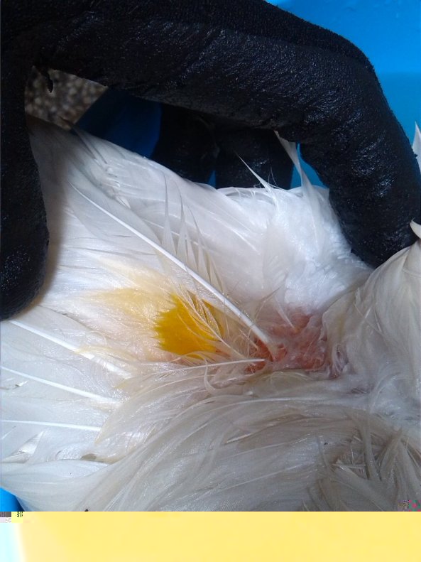 Ti spiego, quel giallo che vedi sulle piume della coda è il grasso della ghiandola dell'uropigio, utilizzato da tutti gli uccelli (in particolare in quelli acquatici) per pulire il piumaggio impermeabilizzandolo e rendendolo lucido.